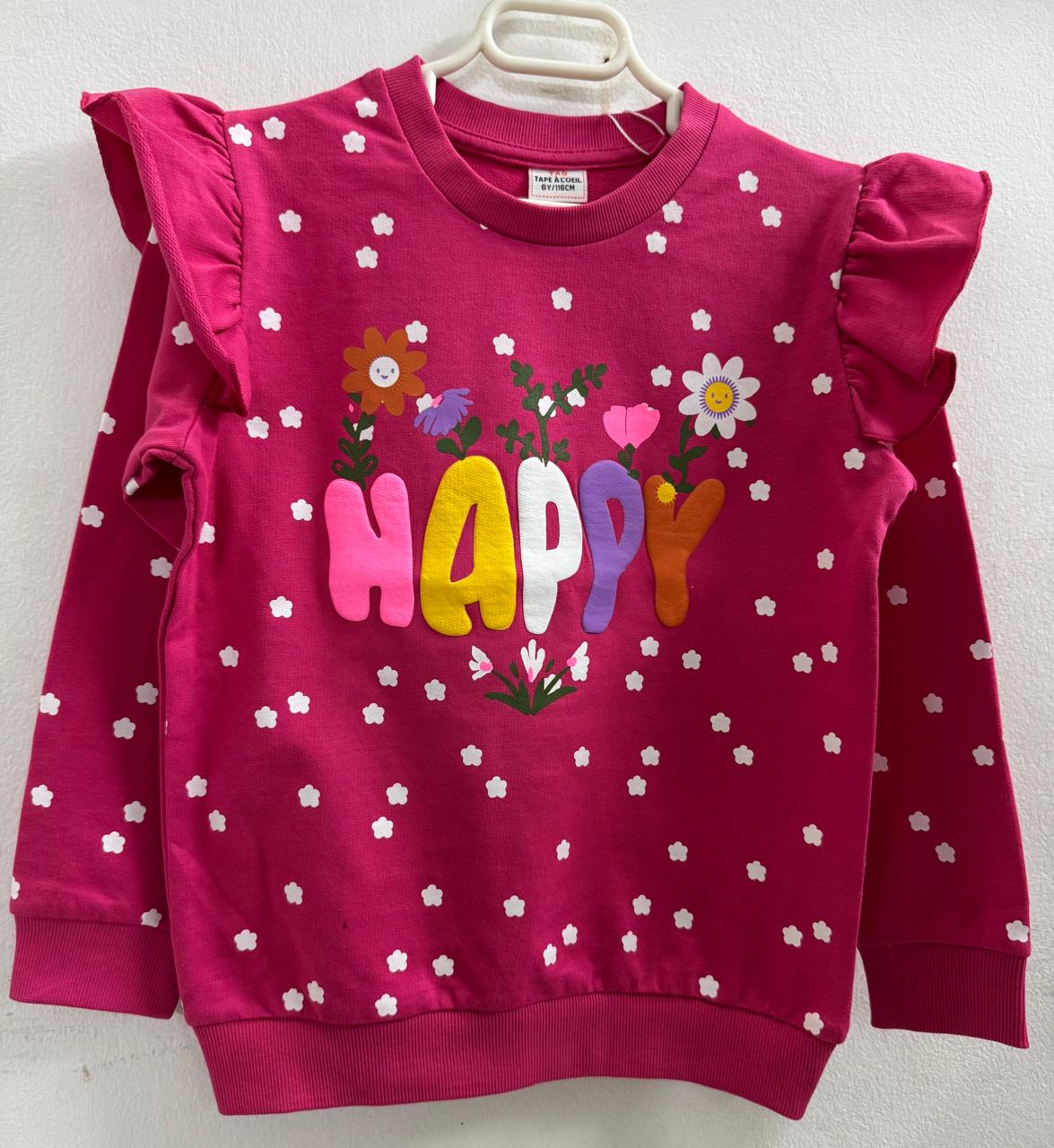 Crew neck, long-sleeve printed sweatshirt. Comfortable and durable with its 2-thread fabric, “HAPPY” text on the sweatshirt, and ruffle details on the shoulders